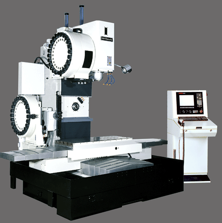 An H / V -43 in our shop just prior to shipping. This model is 6 1/2 axes driven by the Heidenhain 530i control. 1) X axis 2) Y axis 3) vertical head 4) horizontal head 5) table rotation 6) table tilt 6 1/2) quill extension of the horizontal spindle. |